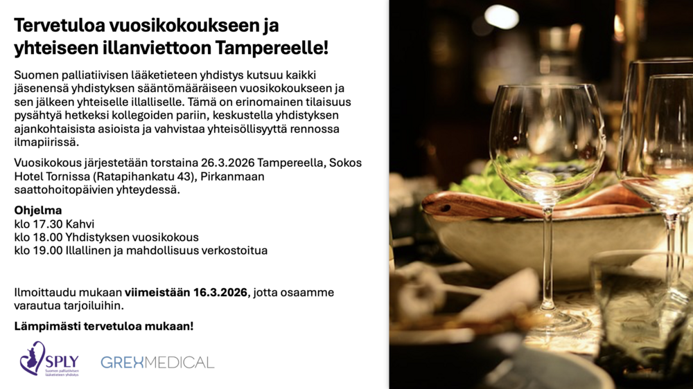 Kohderyhmä: Saattohoidossa toimiva lääkäri- ja hoitohenkilöstö sekä muut aiheesta kiinnostuneet terveysalan toimijat. Ilmoittautuminen on avoinna 15.9.2025–11.3.2026 välisenä aikana. Huomioithan, että…