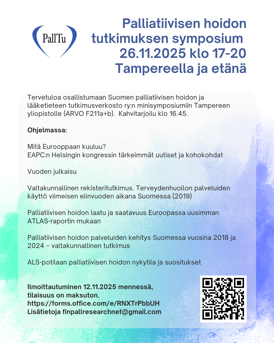 Palliatiivisen hoidon tutkimuksen symposium 26.11.2025 klo 17-20 Tampereella ja etänä