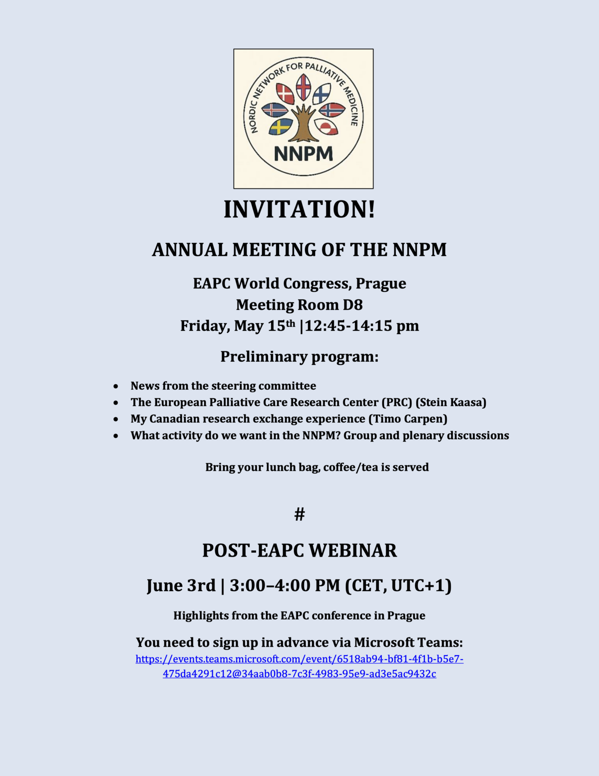 June 3rd | 3:00–4:00 PM (CET, UTC+1) Highlights from the EAPC conference in Prague You need to sign up in advance via Microsoft Teams: https://events.teams.microsoft.com/event/6518ab94-bf81-4f1b-b5e7-475da4291c12@34aab0b8-7c3f-4983